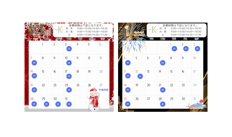 2025.12.01 / 未分類 診療日のお知らせ 12月、令和8年1月の診療日はカレンダーの通りとなります。 12月27日(土)は午前のみの診療となります。 年末年始は12月28日(日)〜令和8年1月4日(日)までとなります。 年末年始は混みあいますので、急患の方は必ず電話でご連絡ください。 < 前へ